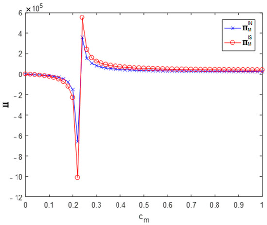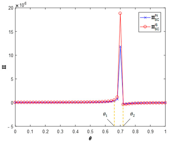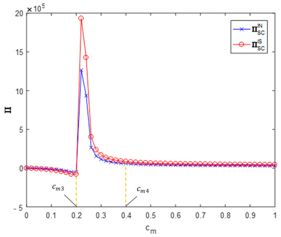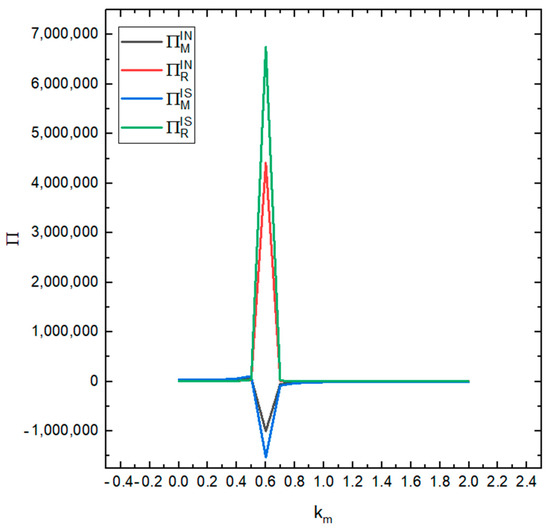 Figure 5, Figure 6 and Figure 7 analyze the impact of recyclers’ information sharing on the profit of the supply chain. Letting , and , the impact of the recyclers’ information sharing strategy on the overall profit of the CDW resource utilization supply chain with the change of the efficiency of environmental responsibility investment can be obtained (as shown in Figure 5). According to these values, information sharing in area will reduce the overall profit of the supply chain (). Information sharing in region will increase the overall profit of the supply chain (). In the area , information sharing makes the overall profit of the supply chain slightly increase but not significantly. Letting , and , the impact of the recyclers’ information sharing strategy on the overall profit of the CDW resource utilization supply chain with the change of the cross-recycling price influence coefficient can be obtained (as shown in Figure 6). Accordingly, in the region , information sharing has no significant impact on the overall profit of the supply chain. Information sharing in region will increase the overall profit of the supply chain (). In the region , information sharing has no significant impact on the overall profit of the supply chain. Letting , and , the impact of the recyclers’ information sharing strategy on the overall profit of the CDW resource utilization supply chain with the change of the offline recycling channel market share can be obtained (as shown in Figure 7). Per these values, information sharing in the region will increase the overall profit of the supply chain () and information sharing in area will reduce the overall profit of the supply chain (). It can be seen that the numerical simulation results are consistent with the above conclusions.