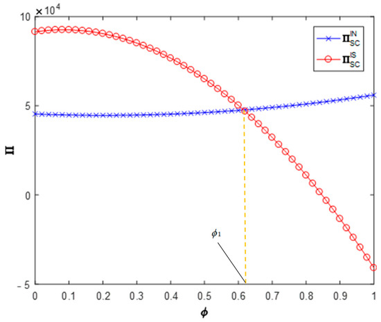 Setting , and allowed us to get the influence of the recycler’s information sharing strategy on the profit of the remanufacturer (as shown in Figure 3).