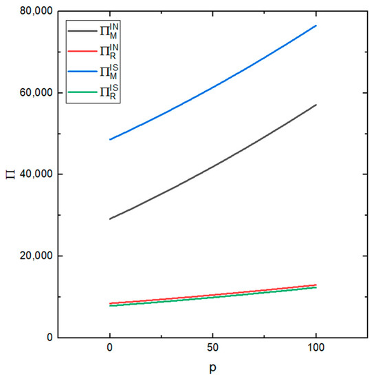 Figure 8 shows the influence of the market selling price p of remanufactured products under different values on the profits of the remanufacturer and the recycler under the two conditions (whether the recycler’s information is shared or not). It can be seen from the figure that the remanufacturer is more sensitive to the change in this value, while the recycler is less sensitive to this change. But, as can be seen from the figure, as p increases the profits of the recycler and the remanufacturer will also increase. This shows that the higher the market price of remanufactured products, the higher the profits of the remanufacturer and the recycler. Raising the selling price of the remanufactured products can effectively improve the profits of the recycler and the remanufacturer and increase the total profits of the supply chain.