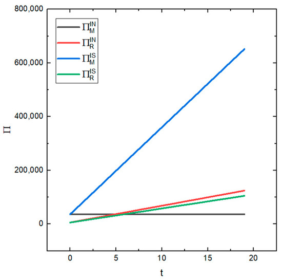 This section uses a numerical analysis model and the correctness of the conclusions to analyze the impact of recyclers’ information sharing on the supply chain performance in the CDW resource utilization supply chain. According to the existing research, we determined the values of the following parameters: [49], [50]. Ten experts from the construction waste resource utilization supply chain field (including professors, doctors and masters) discussed the reliability and importance of the remaining parameters through face-to-face discussions and confirmed the following: , , , , , and . It is worth noting here that despite the high environmental value of CDW its market recycling demand is volatile. Currently, the time cost for consumers to sell CDW may be greater than the income that these sales generate. When most consumers choose a CDW disposal method, it is not necessarily their first choice to sell to a recycler or remanufacturer. Therefore, the market demand is not stable. This variance not only expresses the degree of deviation of the sample from the mean, but also reveals the degree of fluctuation within the sample. It can also be understood that the variance represents the expectation of the fluctuation of the sample. Therefore, based on the uncertainty of the market demand in reality, after expert discussion, the value of was set to 100,000.