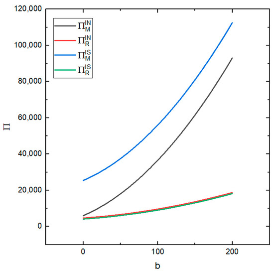 Figure 10 shows the impact of consumers’ green development concept on the profits of the remanufacturer and the recycler under the two conditions (whether or not the recycler’s information is shared or not). It can be seen from the figure that the remanufacturer’s profit is more sensitive to b than the recycler’s profit and it is more sensitive to b in both cases, i.e., the recycler sharing their information and the recycler not sharing their information. That is, with the increase in b, the profit of the remanufacturer also increases and, although the profit of the recycler also increases, the recycler’s increase is small. This shows that improving consumers’ green development concept can increase the total profit of the supply chain.