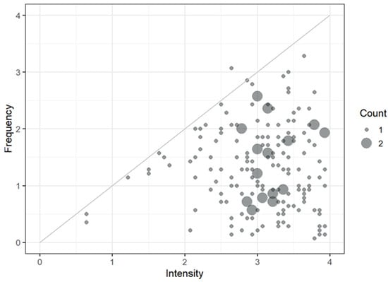 Italian Pediatric MDS-R results. Each subject’s overall intensity and frequency score were calculated, both as the average responses on the corresponding scale. The two resulting total scores were compared by placing them on a scatterplot where each dot represents a subject. When several subjects have the same value, the diameter of the corresponding dot increases in proportion to the number of subjects (Count). Almost all the points lay below the diagonal, mainly occupying the lower right quadrant highlighting that the intensities are generally high and the frequencies low.
