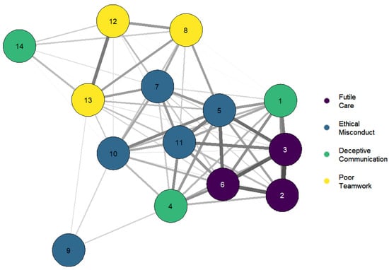 We calculated the items’ composite scores. Figure 3 represents Pearson correlations where the instrument is visualized as a network. The maximum correlation value is r = 0.63 (for the full correlation matrix, see Table S3—Supplementary Materials). Figure 3 shows that the items of the Futile Care (FC), Ethical Misconduct (EM), and Poor Teamwork (PT) scales are close to each other. This finding matches what we expected, assuming the factorial structure of Lamiani et al. Conversely, a relevant separation was found between the items on the Deceptive Communication (DC) scale where item 14 (“Ignore situations in which parents have not been given adequate information to ensure informed consent”) appears better linked to the PT scale, while items 1 (“Witness healthcare providers giving “false hope” to parents”), and 4 (“Follow the family’s request not to discuss death with a dying child who asks about dying”) connected to both FC and EM factors. Based on their semantics, we then relocated items 1 and 4 to FC and EM.