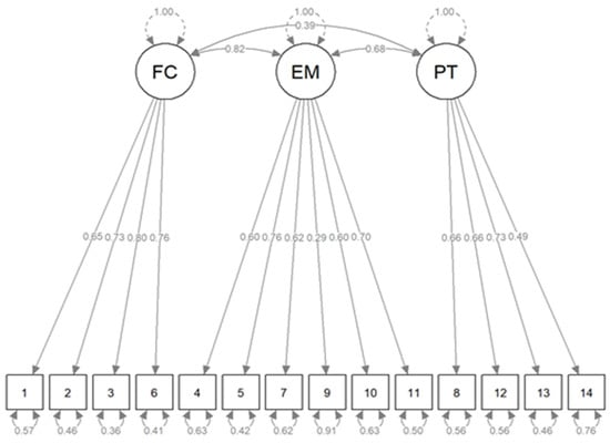 - Three-factor: A model obtained by dissolving the scale DC and assigning its three items to the other scales (item 1 to FC, item 4 to EM, item 14 to PT).