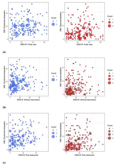 However, regarding relevance of the MBI, we deepened the correlation study using a visual inspection and considering the single factors of the Italian Pediatric MDS-R (Figure 5). Mainly referring to the relation with the MBI-DP scale (Figure 5b, red), plots show a fan-like structure where it seems possible to identify three groups: subjects with low moral distress and no burnout; subjects with high moral distress and low burnout; subjects with high moral distress and high burnout.