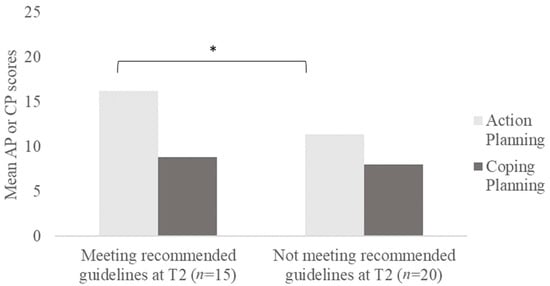 Differences in mean action and coping planning scores for participants who did not meet recommended physical exercise guidelines at time point 1 (n = 35). Note. * = statistically significant difference at p < 0.05 level.