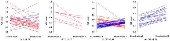 The analyses of GT changes in relation to the tooth type exchange, i.e., deciduous incisor (D) to partially (P PE) or completely erupted permanent incisor (P FE) as well as the degree of eruption (P PE-P FE and P FE-P FE) were also carried out. Transition D with permanent successors, independently partially (D-P FE) or completely (D-P FE) erupted, was accompanied by a statistically significant reduction in GT (Table 2). The GT reduction associated with the replacement of the D-P FE was almost twice higher than the D-P PE, by 0.27 vs. 0.14 mm, respectively. In contrast, the average GT of the lower permanent incisor already presented during the first examination increased significantly by 0.07 mm, while continuing the eruption (P PE-P FE and P FE-P FE). A particularly greater increase in GT (by 0.21 mm) was noted in the area of the P-FE at the baseline examination. GT changes are graphically shown in Figure 2.