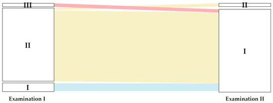 The most frequently observed type of lower lip frenum attachment at the baseline study was the gingival attachment (II) (n = 73.88% participants). Eight children (9.6%) expressed the mucosal attachment (I) and 2 (2.4%) the papillary attachment (III). The gingival attachment, diagnosed at the first examination, after two years turned into the mucosal attachment in 96% of cases (p < 0.001) (Figure 4). This was the dominant type at the second examination (n = 81, 97.5% of cases). The papillary attachment (III) at the baseline examination evolved to the mucosal type (I) during the two-year growth up period. Papillary penetrating attachment (IV) was not observed.