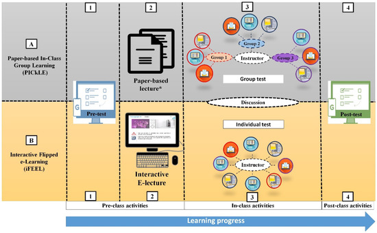 In the iFEEL activity, the students took an online pre-test (step B1), and then the students were instructed to review the e-lecture and answer the questions embedded in the lecture prior to the class (Step B2). During the class, students were instructed to solve an open-book online exam, individually (Step B3). Similar to PICkLE, the instructor’s role involved resolving the students’ inquiries and emphasizing common mistakes. The students took the post-class test after the class ended (B4).