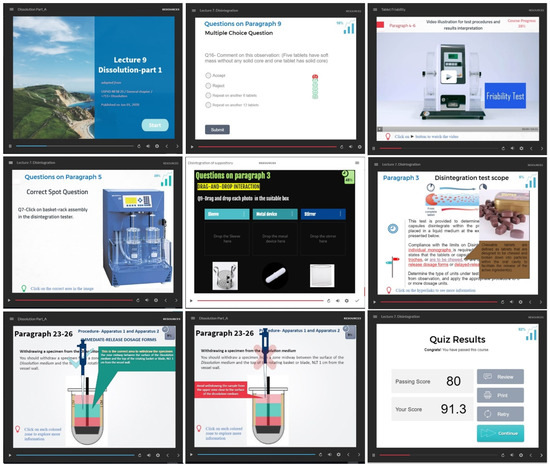 A variety of software and applications were utilized to facilitate student learning, comprehension, and online assessment. Blackboard® is the standard learning management system provided by KSU. Storyline 360®, an e-learning authoring application designed by Articulate Inc., New York, USA, and Camtasia® 2020 Education, a screen recording and video editing software, developed by TechSmith Corporation, Okemos, MI, USA, were utilized to design the e-lectures. Google Forms® software was provided as part of the free, web-based Google Docs Editors suite offered by Google.