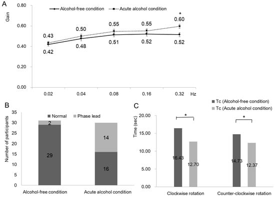 Among several agents reported to affect the vestibular system, acute alcohol is a well-known agent to cause instability, dizziness, and increase the fall risk. Many studies evaluated the effect of alcohol on the vestibular system before [3,4,5,6,7,8,9,10,11,12,13,14]. Early studies have demonstrated the change in the oculomotor system, including impaired saccade velocity and reaction time [3,4,5,6], reduced velocity of smooth pursuit and optokinetic slow-component [5,6], decreased visual suppression [7,8], and presentation of gaze-evoked nystagmus [9]. Other studies investigated the effect of alcohol on the VOR with caloric test or head rotation tests [10,11,12,13,14]. Alcohol is reported to degrade VOR suppression in both passive head rotation (0.11–1 Hz) and volitional head rotation (0.5–3 Hz) [10,11]. The slow phase velocity of nystagmus decreased, and VOR gains reduced when triggered by caloric test after alcohol intake [12,13]. Recent studies have investigated the effects of alcohol on otolith function by examining vestibular evoked myogenic potentials [12] and the perception of subjective visual horizontal [14], but these results were not consistent. Studies that had focused on the postural control reported balance alterations in alcoholic individuals but failed to identify consistent defects in the vestibulo-oculomotor pathways [15,16].
