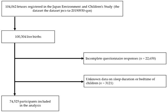 - Kawamoto, T.; Nitta, H.; Murata, K.; Toda, E.; Tsukamoto, N.; Hasegawa, M.; Yamagata, Z.; Kayama, F.; Kishi, R.; Ohya, Y.; et al. Rationale and study design of the Japan Environment and Children’s Study (JECS). BMC Public Health 2014, 14, 25. [Google Scholar] [CrossRef] [PubMed] [Green Version]