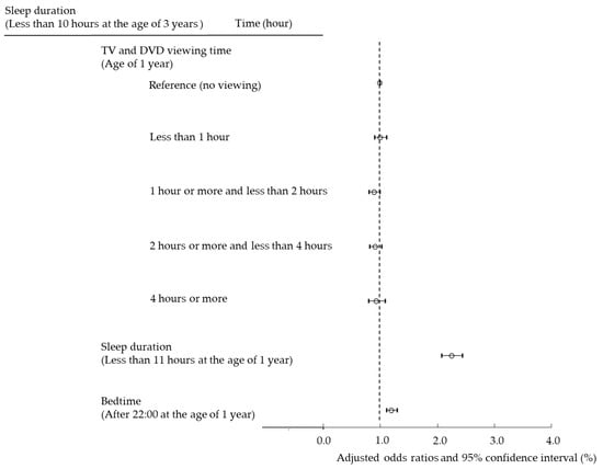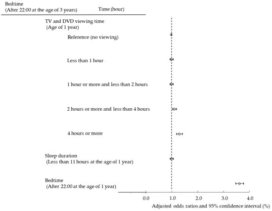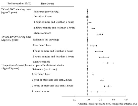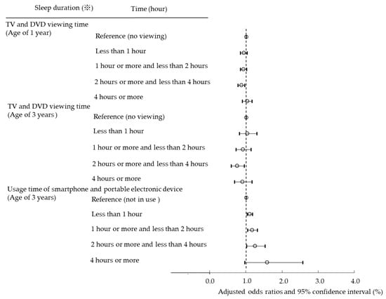 Chicago/Turabian StyleNishioka, Takafumi, Hideki Hasunuma, Masumi Okuda, Naoko Taniguchi, Tetsuro Fujino, Hideki Shimomura, Yasuhiko Tanaka, Masayuki Shima, Yasuhiro Takeshima, and Japan Environment and Children’s Study Group. 2022. "Effects of Screen Viewing Time on Sleep Duration and Bedtime in Children Aged 1 and 3 Years: Japan Environment and Children’s Study" International Journal of Environmental Research and Public Health 19, no. 7: 3914. https://doi.org/10.3390/ijerph19073914
