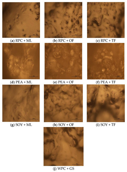 The effect of the use of various protein-syrup combinations on the texture parameters and the cutting resistance force is presented in Table 1. The microscopic images of the microstructures of the tested high-protein bars are given in Figure 1a–j. Based on the analyzes, significant (p < 0.05) differences were observed between the performed trials. According to the research, the control bars made of commonly used sources (WPC + GS) were characterized by the greatest hardness (281.90 N). The least hardness parameters were found in the samples made of soy (18.76 N) and rice (19.92 N) proteins combined with maltitol syrup (SOY + ML and RPC + ML). It is worth noting that least hardness parameters for the individual types of tested high-protein bars are possibly related with the equally small cut resistance parameters.