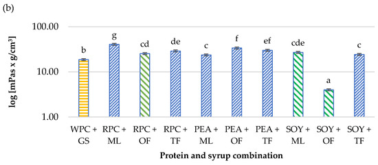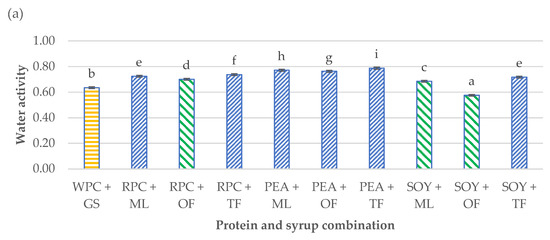 Influence of the combination of proteins and syrups on the (a) water activity (aw) and (b) ultrasonic viscosity of the developed high-protein bars. The letters (a–i) indicate significant differences at p < 0.05 (Tukey’s HSD test). The control sample color is yellow. The best prognostic samples for both determinations are marked green. The aw tests were carried out in five repetitions (n = 5) and ultrasonic viscosity in three replications (n = 3).