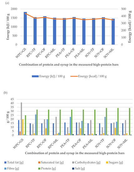 Influence of the combination of proteins and syrups on the (a) energy value and (b) nutritional value of the developed high-protein bars.