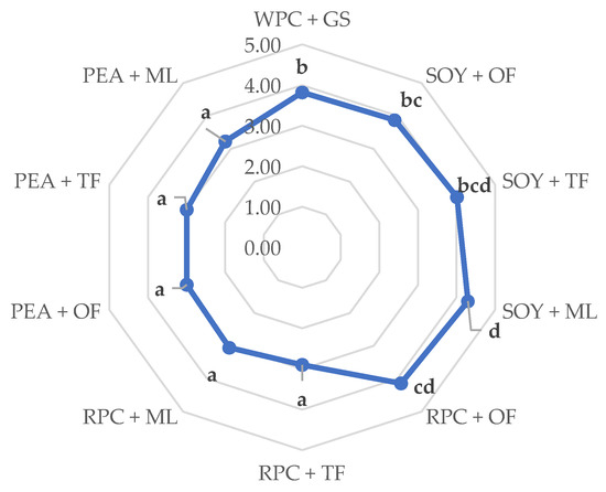 Influence of the combination of proteins and syrups on the sensory evaluation of the developed high-protein bars. The letters (a–d) indicate significant differences at p < 0.05 (Tukey’s HSD test). Fifteen trained evaluators participated in the study (n = 15).