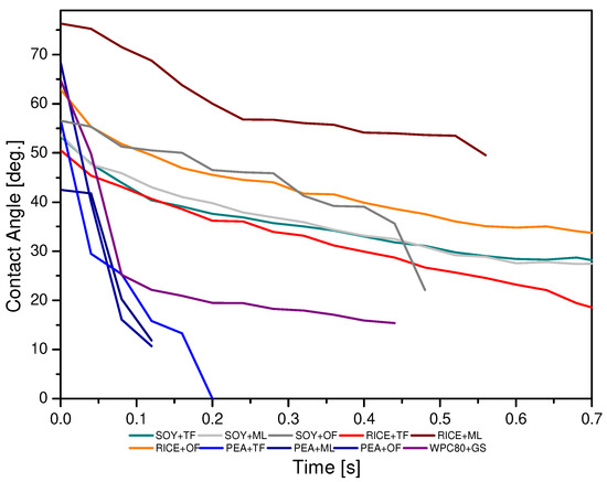 Wettability is a very important physical property that characterizes the surface of materials. Its value determines the basic functions of food products and other materials, including adhesion or lubricity [43]. The purpose of the study of the surface structure was to determine the degree of hydrophobicity, hydrophilicity, and surface roughness depending on the type of protein and syrup used. The measure of the wettability of a solid surface with a small molecular weight liquid is the angle (colloquially called the contact angle) between the tangent to the droplet at the point of contact with the surface being tested and this surface. Thus, the measurement of the static contact angle can be reduced to placing a drop of a low molecular weight liquid on the surface of the tested material, measuring the angle of inclination of the tangent to the outline of the drop surface at the point of its contact with the substrate [44]. The results of the obtained contact angles are shown in Figure 5. They indicate significant differences in the obtained parameters depending on the combination of proteins and syrups.