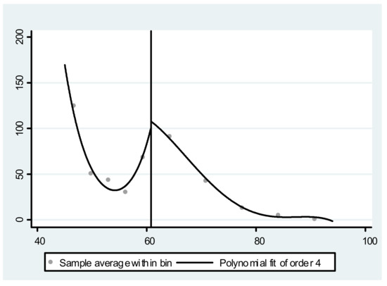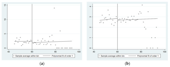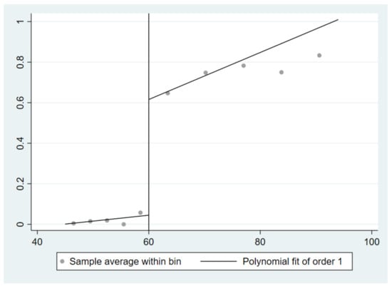 In the implementation of the NRP, there are also some individuals over 60 years old that do not receive the pension. Therefore, we assume that g1(zi) > g0(zi); that is, the probability of rural elderly people over 60 years old receiving the NRP is greater than that of those under 60 years old. In the case that Equation (6) holds, we call it fuzzy RD.