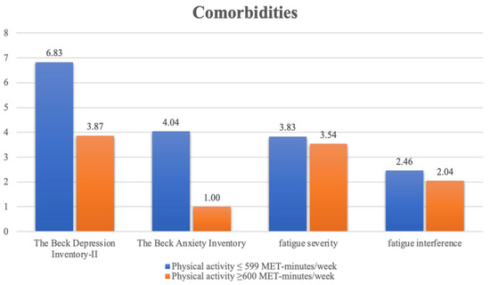Among the patients with comorbidities, those who engaged in moder-ate-intensity physical activity had significantly lower overall BDI-II (p = 0.032), and BAI (p = 0.029). However, both fatigue severity and fatigue interference scores did not differ significantly by comorbidities (Figure 1).