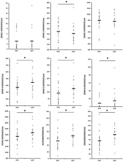 The analysis of running intensity defines the pace of each player during the game and the metres covered in the high intensity running zones are associated with the best sports performance []. Previous studies have described a positive relationship between individual physical fitness and running performance in team sports for elite, sub-elite, recreational and school participants [,,]. In this vein, we found that the GPF group covered more metres in Zone 4 (running), Zone 5 (high-speed running) and Zone 6 (sprinting) than the PPF students. In addition, few students from the PPF group could run in the sprinting zone compared to the GPF group (9 vs. 15 students), so individual fitness seems to be an important factor for physical performance. Accordingly, Fairclough and Stratton [] stated that high-ability students spend more time during physical education sessions in MVPA zones than average and low-ability students.