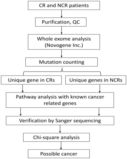 Statistical analysis was employed by a Chi-square test using SPSS software. Individual variants were tested for chi-square to find the significant (p < 0.05) genetic biomarker for each CR or NCR group. The workflow of the methods has been shown in the Figure 1 below.