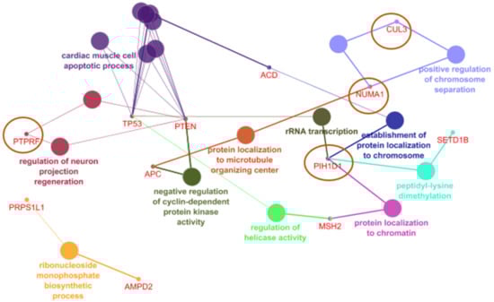 ClueGo analysis revealed six common NCR genes shown in Figure 2, which could be related with known cancer genes: ACD can be related with TP53 through cardiac muscle cell apoptosis. PIH1D1 may also be related to TP53 through rRNA transcription. With the PTEN gene, PTPRF may be associated through regulation of neuron projection. NUMA1 could be related to CUL3 through positive regulation of chromosome regulation and with APC through negative regulation of cyclin dependent protein kinase activity.