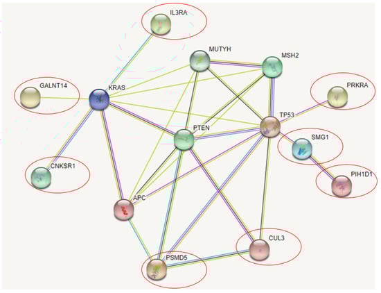 STRING analyzes different genes to be related directly or indirectly with cancer risk genes, shown in Figure 3: GALNT14, CNKSR1, IL3RA, SMG1, PRKRA, and PSMD5. Similarly, with ClueGo, CUL3 and PIH1D1 were also included in the STRING prediction. All over, PTEN was suggested to play a central role in the gene interaction, the NCR-common genes could be associated with it either directly or indirectly. GALNT14, CNKSR1, and IL3RA could be related with KRAS. SMG1 and PRKRA may be associated with TP53. PIH1D4 was predicted to be indirectly associated with TP53 through SMG1. CUL3 was predicted to interact with PTEN and PSMD5. Besides CUL3, PSMD5 may interact directly with APC and PTEN.
