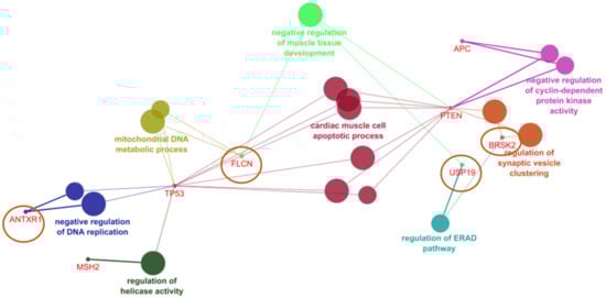 ClueGo revealed four genes shown in Figure 4, which could associate with the known cancer risk genes: ANTRX1, FLCN, USP19, and BRSK2. ANTRX1 could interact with TP53 and play a role in negative regulation of DNA replication. FLCN could also be associated with TP53 through mitochondrial metabolism. FLCN may also interact with PTEN and involved in the negative regulation of muscle development. BRSK and USP19 could work together in endoplasmic reticulum associated protein degradation, while USP19 may play a role in dysregulation of muscle development. BRSK and PTEN may act together in regulation of synaptic vesicle clustering.