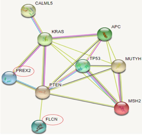 STRING revealed three possible genes, shown in Figure 5, associated with known risk genes. PREX2 may present the strongest association among them since they may interact with KRAS and PTEN genes. FLCN could weakly interact with PTEN, while CALML5 was shown to interact with the KRAS gene.