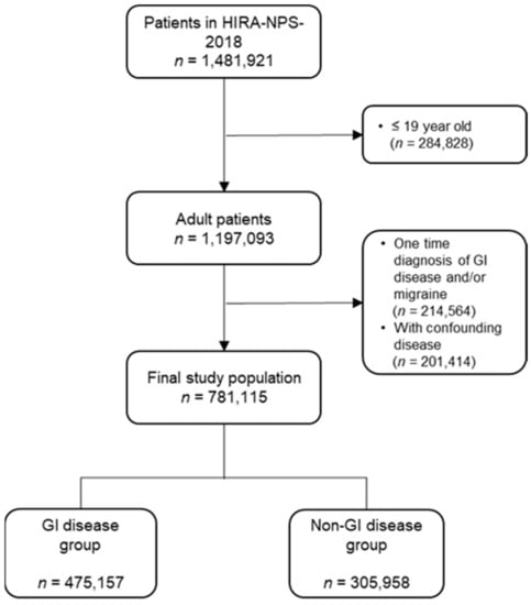 We included patients older than 19 years. We classified patients with diseases diagnosed at least twice a year. Therefore, the cases in which migraine or our target GI diseases were diagnosed only once were excluded. In addition, patients who were diagnosed with a disease that could increase the risk of migraine were excluded from the study. The excluded diseases included neuropsychiatric disorders, headaches other than migraine, some cerebrovascular diseases, and some cardiovascular diseases (Supplementary Table S1) [13,14,15,16].