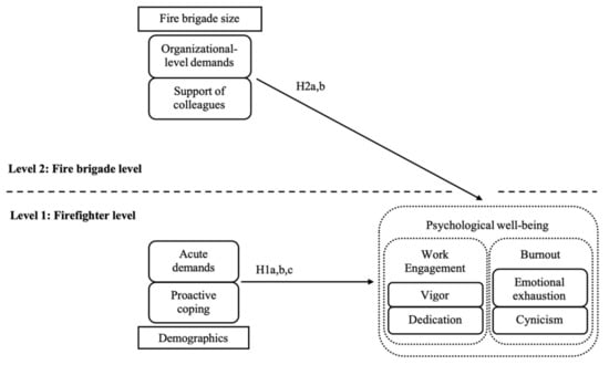 Stress in fire personnel is not only caused by individual characteristics or demands at firefighter level []. Fire brigades consist of direct command and control hierarchies, have clear goals, and are functionally organized to fulfil their duties. Because of the high level of coordination required to complete their tasks successfully during fire emergency situations, firefighters share common experiences, values, knowledge, and perspectives to understand organizational events and interpret organizational-level demands. In this context, organizational-level demands are unit or organizational characteristics that require sustained mental effort, and hence, are associated with physiological or psychological costs []. Examples of firefighters’ organizational-level demands are the use of inadequate or impaired equipment or technology, understaffed situations, excessive overwork or double-shift due to lack of proper work scheduling, misleading information or wrong reports about scenarios, and coordination with other rescue forces. Along with unpredictable emergency situations, these organizational-level demands, which affect the whole fire brigade and are beyond their individual control, have consequences on their well-being []. Therefore, we expect that:
