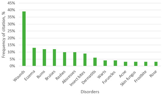 We documented 67 species of medicinal plants from 37 families used for skin diseases and cosmetics. All of the collected data are summarized in Table S1 (Supplementary Materials). According to our results, the most common indication of skin diseases were wounds (39%) (Figure 3).