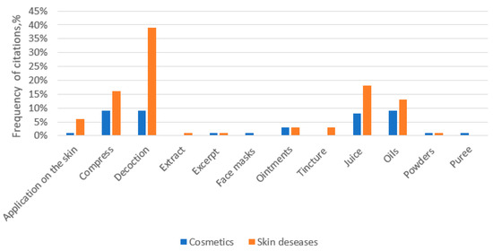 As in treatment of skin diseases, honey, pig fat, eggs, and buttermilk represented the most reported ingredients of animal origin in cosmetic applications. The face was washed with whey to remove freckles so that the skin was “clear”. The acid of ants was also used to remove freckles. This acid was acquired by throwing a scarf on an anthill, and when it dampened, the freckles were rubbed with it. Decoction, juice, and tincture with oil were most popular ways of preparation (Figure 4). As pointed out by Svanberg I [10], birch sap was the second most valuable product after wood to be found in the forest. It is renowned for antioxidative nutrients and high content of minerals. In northern Europe, birch sap has long been used not only as a food source but also for healing and cosmetics. The cosmetic use of birch sap was widespread in Estonia, where in the 19th century it was believed that washing the face with the first drops of birch sap will get rid of freckles and that the face will stay clear all summer. It was also used to treat skin diseases. In Lithuania, it was popular to rinse hair with birch sap. In this study, birch sap was also used to remove freckles and treat acne, blackheads, dry skin etc. Among the respondents, it was mentioned that the juice is frozen to ice and used to treat swollen eyes and to smoothen small wrinkles. To treat an oily scalp, two tablespoons of honey are mixed with four tablespoons of juice and a pinch of heated salt. The mixture is then diluted in half a glass of vodka, and it is then kept in a dark place for 10 days. The mixture is then rubbed into the oily scalp before washing.