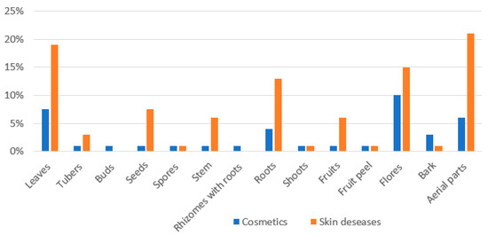 Although the most common method of administration is decoction usually used internally, in this case a decoction is prepared from plant-based raw materials and placed externally on the area affected by skin diseases. Only two types of plant raw materials were used internally, namely the decoction of Viola tricolor L. aerial parts for the treatment of furuncles, eczema, and rashes, the other internally used substance being a decoction made with roots of Elytrigia repens L., used to treat skin lesions, furuncles, and rashes. Decoction was the most common method of preparation in this study, using a soft above-ground part of the plant, so it is not surprising that the most used parts of the plant were aerial parts, leaves and flowers (Figure 5). The hard parts of plants (i.e., the seeds, stem, bark, and the fruits) were used less often, and less common preparation methods were used to prepare them, such as extraction with oil and tinctures.