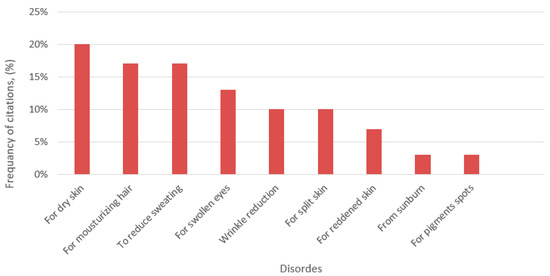 Data on ethnopharmaceutical applications for cosmetic use made up 13.44% of our research (Table S1). Ethnobotanical studies combined with modern analyses of plants have a potential to enrich modern cosmetic products. Plants with cosmetic uses have often been neglected in ethnobotanical surveys which focus mainly on plants with medicinal and culinary uses [38,39,40]. Often, the target of researchers is the measures for treatment of skin conditions, but during the course of the study, it has been revealed that many of the plant preparations for therapeutic purposes were also used for cosmetic purposes, and making a clear distinction among the recorded preparations between cosmetics, cosmeceuticals and pharmaceuticals for the treatment of skin diseases is very problematic [41,42,43]. Although it may seem that the treatment of skin diseases is more important than skin care for cleanliness, prevention and restoration, beautification has also played an important role in rural communities. Studies show that the need for beauty treatments, including natural ones, has not diminished during the COVID-19 pandemic [44]. In our study during the COVID-19 pandemic in Lithuania, the main cosmetic uses were skin (20% of reports) and hair hydration (17%) and sweat reduction (17%) (Figure 6).