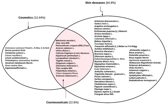 The data from our study shows that the same plants are often used for cosmetic purposes and for the treatment of skin diseases. This distinguishes a separate group of cosmeceuticals. The term “cosmeceuticals” was first used by Raymond Reed in 1961 and the word and concept were further popularized by Dr Albert Kligman in the late 1970s [12]. Cosmeceuticals are both cosmetic and pharmaceutical preparations, intended to enhance health and beauty through ingredients that influence the skin’s biological function. These are cosmetic products that are not just used for beautification but also for different skin ailments, from acne-control and anti-wrinkle effects to sun protection. Medicinal plants as ingredients act not only as cosmetics, but also as pharmaceuticals [12]. In this study we highlighted medicinal plants used for cosmetics and for the treatment of skin diseases (Table S1). According to the results of our study, medicinal plants used for the treatment of medical disorders and for cosmetic purposes can be singled out as potential cosmeceuticals (Figure 7).