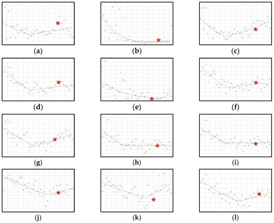 A schematic graph of the frequency of use of the ingredients in the respective quarters in the period from the first quarter of 2012 to the fourth quarter of 2021. The star denotes the moment of publication of a scientific opinion or a resolution concerning the ingredient. The height of placement of the symbol reflects the level of use of the ingredient. (a): Copper (Figure A17); (b): Fluorine (Figure A18); (c): Iodine (Figure A19); (d): Iron (Figure A20); (e): Isoflavones (Figure A21); (f): Magnesium (Figure A22); (g): Vitamin A (Figure A23); (h): Vitamin B1 (Figure A24); (i): Vitamin B2 (Figure A25); (j): Vitamin B6 (Figure A26); (k): Vitamin C (Figure A27); (l): Vitamin E (Figure A28).