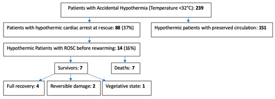 This study is a retrospective cohort analysis of data from the International Hypothermia Registry (https://www.hypothermia-registry.org (accessed on 1 December 2021).) (IHR). In 2008, we created the IHR to gather information of patients who were victims of accidental hypothermia. The International Hypothermia Registry contains information of patients of all ages diagnosed with accidental hypothermia and a core temperature less than 32 °C. There are no restrictions on the etiology of hypothermia. This registry is mainly prospective but retrospective entries are welcome. A total of fifty-two hospitals in Austria, France, Italy, Poland, Switzerland, the United Kingdom, and the United States of America participate in the IHR. The majority of the centers are university hospitals, and a minor number are primary or secondary hospitals, located in the mountains. One year after the accident, patients were contacted and outcome data were investigated.