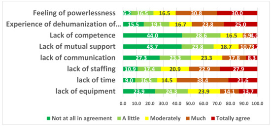 - Feeling of difficulty in accompanying residents infected with COVID-19 or their families due to lack of equipment (PR = 1.2 [0.5–2.6]), lack of time (PR = 6.7 [0.9–47.5]), or perceived powerlessness (PR = 2.8 [0.7–10.5]);