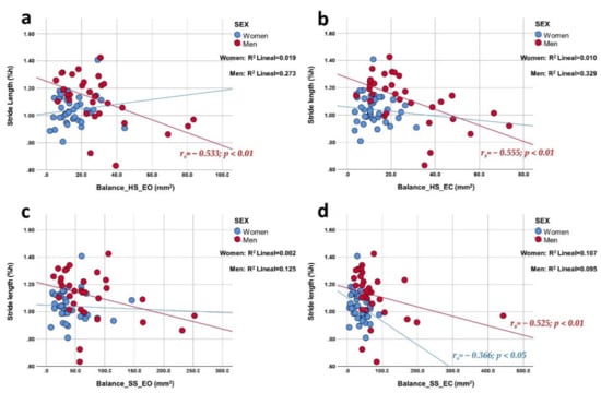 The Spearman rho test was performed to assess the correlation between the gait and balance parameters (Table 3). In older men, stride length (Figure 1) and step length (Figure 2) showed high and negative correlations in almost all balance tests, except in soft surface EO, which showed a moderate correlation. Women only presented a mean negative correlation in the soft surface EC test concerning both indicated gait parameters.