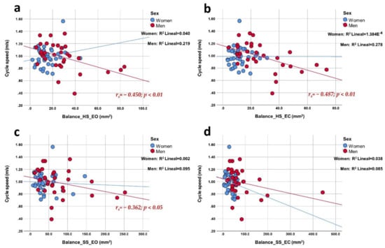 Correlation plots of gait cycle speed compared to balance area in each of the tests. Each image shows the correlations obtained distributed by sex. The upper part of the figure shows the results for a hard surface with eyes open (panel (a); linear R2 women: 4.0%; men: 21.9%) and closed eyes (panel (b); linear R2 women: 0.0%; men: 27.8%); the lower part shows the results for a soft surface with open eyes (panel (c); linear R2 women: 0.2%; men: 9.5%) and closed eyes (panel (d); linear R2 women: 3.8%; men: 8.5%).