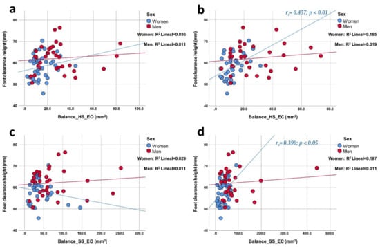 Correlation plots of foot clearance height compared to balance area in each of the tests. Each image shows the correlations obtained distributed by sex. The upper part of the figure shows the results for a hard surface with eyes open (panel (a); linear R2 women: 3.6%; men: 1.1%) and closed eyes (panel (b); linear R2 women: 18.5%; men: 1.9%); the lower part shows the results for a soft surface with open eyes (panel (c); linear R2 women: 2.9%; men: 1.1%) and closed eyes (panel (d); linear R2 women: 18.7%; men: 1.1%).