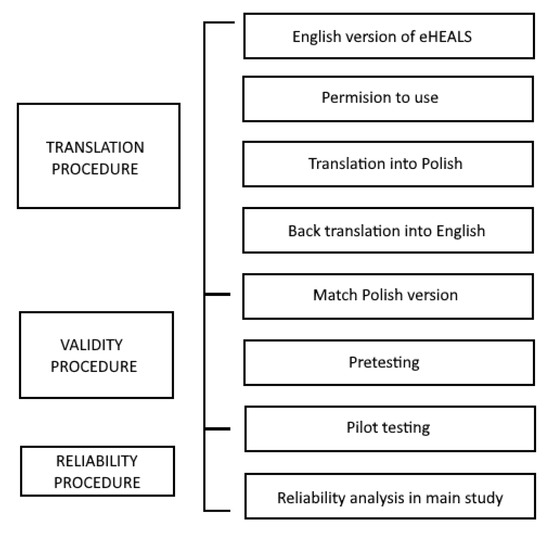 Before the validation process, we asked Dr. Cameron D. Norman, one of the authors of the eHEALS instrument, to give his approval to the Polish translation and use of eHEALS in the current study. Such a permission was obtained. The Polish adaptation of eHEALS was developed following the translation and adaptation process of the instrument suggested by the World Health Organization [23] but with some modifications of the procedure. In the first step, two fluent English translators translated the instrument into Polish. The translators were introduced to the purpose of the study, the research procedure, and obtained information about the study sample. Next, both translations were combined to reveal possible significant differences and create a unified Polish version. Semantic or linguistic differences were not revealed at this stage. In the second step of the translation procedure, the instrument was translated back into English and compared to the original eHEALS items. Two translators were again approached, but this time their native language was English. The synthesized translation was compared to the original version of the scale. At this stage, it was found that the translated items were semantically similar to the original ones, therefore, no changes were made to the Polish version (Figure 1).