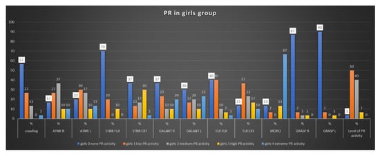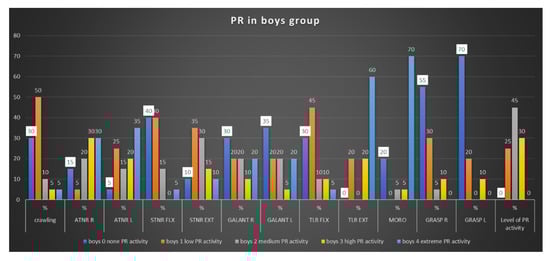 The percentage of PR occurrence in groups of girls and boys is presented in Figure 1 and Figure 2. Of the boys, 75% achieved a higher score of PR activity. In the group of girls, this was under 50%. The least integrated were the Galant Reflex (GR) and Moro Reflex (MR) in the group of younger children, and Tonic Labyrinthine Reflex (TLR) and MR in the group of older children.