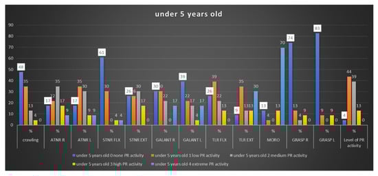 The scale of primitive reflexes (PRs) activity in younger children. Percentage of crawling pattern performance and the reflexes activity.