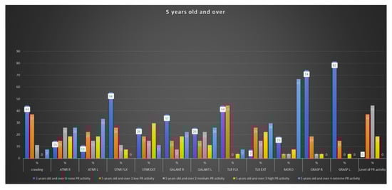 The scale of primitive reflexes (PRs) activity in older children. Percentage of crawling pattern performance and the reflexes activity.