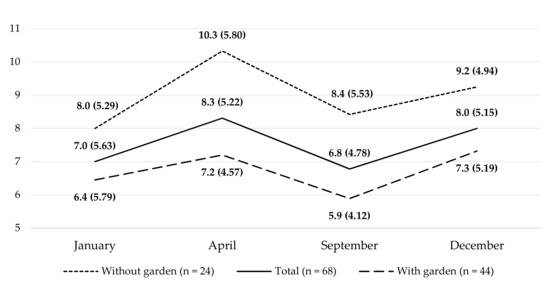 The obtained data were analysed with the IBM Statistical Package for the Social Sciences 26.0 software (IBM Corp., Armonk, NY, USA). The research material was analysed using descriptive statistics, including mean, median, standard deviation and percentages. Prior to analysis, the data distribution was tested for normality using the Shapiro–Wilk test. A two-way repeated analysis of variance (ANOVA) was used to examine the difference at each time point and the relationship between owning a garden and the GDS levels (with all the measurement points included). Multiple linear regression (stepwise) was used to identify the association between the variables extracted in the aforementioned models and the participants’ well-being and mood as expressed by the GDS scale (during the pandemic period, i.e., April, September and December). Prior to the multiple linear regression analysis, the assumption of a linear relationship (using Pearson correlation coefficient) between the outcome variable and the independent variables was tested. A significance level of α < 0.05 was established.