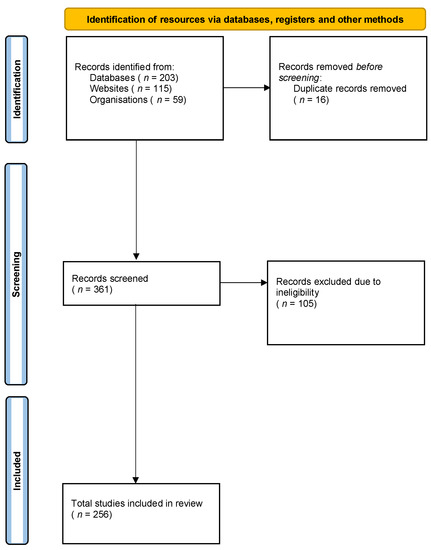 A range of review methodologies were utilised to draw together a broad summary of the current evidence for the efficacy of community-based interventions on vulnerable populations. Here, ‘vulnerability’ is categorised by physical, psychological or socioeconomic circumstances as defined by the Office of National Statistics [16]. An overview of the number of resources identified, screened and included can be seen in Figure 1.