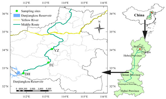 The Henan section spans the subtropical monsoon humid climate zone and temperate monsoon climate zone, characterized by four distinct seasons, simultaneous rain, and heat. The results of previous investigations showed that the areas with strong algae growth were all located in Henan Province. The areas where the main algae grow vigorously bend near the head of the main canal, the relatively flat and straight section in Fangcheng County of Nanyang City, the right bend in Yexian County of Pingdingshan City, and the relatively flat straight section in Yuzhou city in Pingdingshan City. Based on the preliminary survey of algae growth and the ecological location characteristics of the canal, three sampling points were selected from the south to the north along the Henan section canal [13]. The sampling points of Diaohe (DH) canal section in Dengzhou City, Fangcheng (FC) canal section in Nanyang City, and canal section in Yuzhou (YZ) City were selected as sampling sites, respectively (Figure 1).